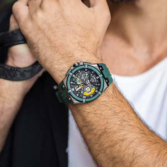 This timepiece doesn’t just keep time—it elevates it, blending modern luxury with technical excellence. Embrace the apex of watchmaking today. Available in Polar White, Aqua Marine, Rose Gold Eclipse, and Desert Tan.